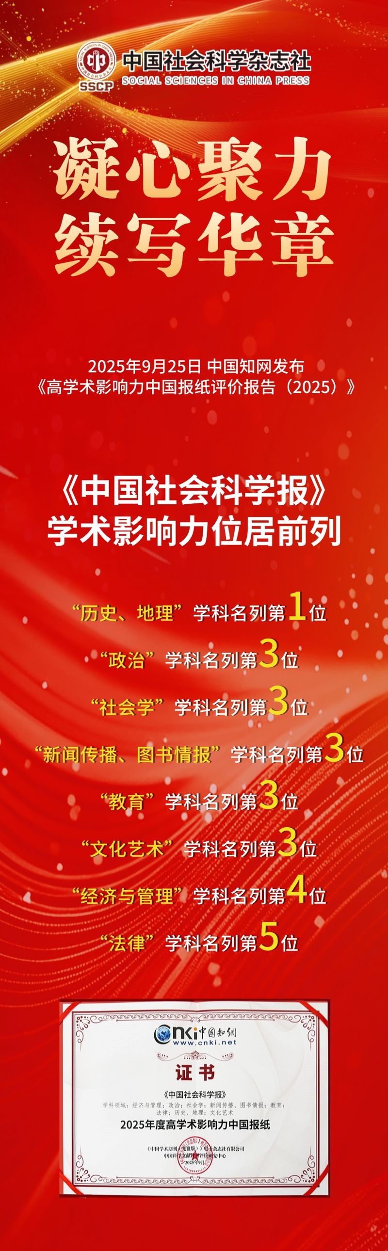 中国社会科学报讯 (记者段丹洁)9月25日,《中国学术期刊(光盘版)》电子杂志有限公司、中国科学文献计量评价研究中心联合发布的《高学术影响力中国报纸评价报告(2025)》(以下简称《报告》)显示,《中国社会科学报》在“经济与管理”“政治”“社会学”“新闻传播、图书情报”“教育”“法律”“历史、地理”“文化艺术”等学科领域学术影响力位居前列。